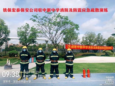 深圳市中新中學為創建平安校園,我司鐵保宏泰深圳保安服務公司協助中新中學進行消防及防震應急疏散演練。增強學生的安全防范意識,增強學生的安全知識,全面提高學生面對地震、火災等應急事件的處理能力,在學校發生緊急情況時,全體師生能安全、快速地進行疏散。通過防震、消防應急疏散演練,使全校師生掌握應急避震、避火的正確方法,熟悉地震或火災發生后緊急疏散的程序和線路,確保在地震、火災來臨時 ,我校防震、消防應急工作能快速、高效、有序地進行,從而最大限度地保護全校師生的生命安全,特別是減少不必要的非震、非火傷害。同時通過演練活動培養學生聽從指揮、團結互助的品德,提高突發公共事件下的應急反應能力和自救互救能力。