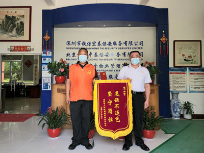 2022年6月24日,龍華區福城街道領導黃燕同志等領導對我司(鐵保宏泰保安公司)派駐疫情卡口值班保安員鐘培華同志給予高度的表揚和認可,并為其頒發了獎金和慰問品以此予以鼓勵。同時強調全體疫情工作人員要向鐘培華同志學習盡職盡責,落實責任,堅決做好疫情防控工作。