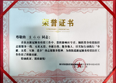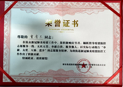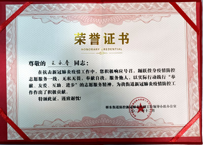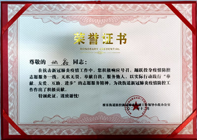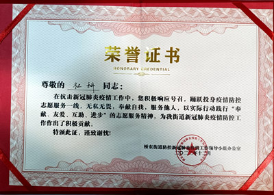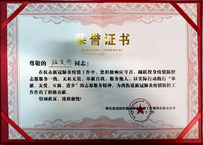 熱烈祝賀我司鐵保宏泰深圳保安公司的優秀安保護衛人員在抗擊新冠肺炎疫情工作中,積極響應號召,踴躍投身疫情防控志愿服務一線,無私無畏,奉獻自我,服務他人,以實際行動踐行“奉獻、友愛、互助、進步”的志愿服務精神,為我街道新冠肺炎疫情防控工作作出了積極貢獻。特頒發榮譽證書。