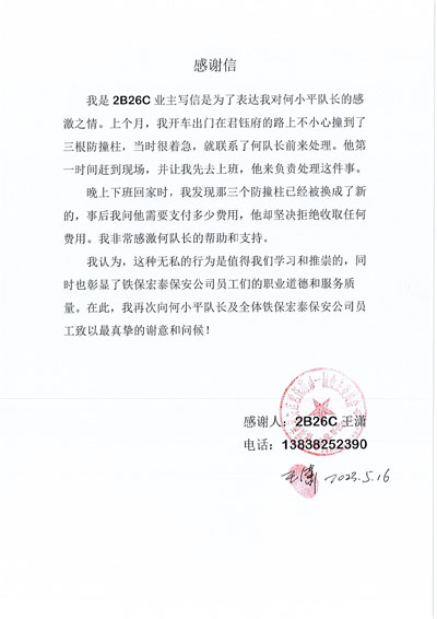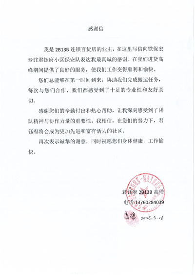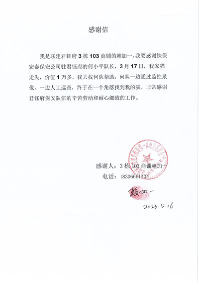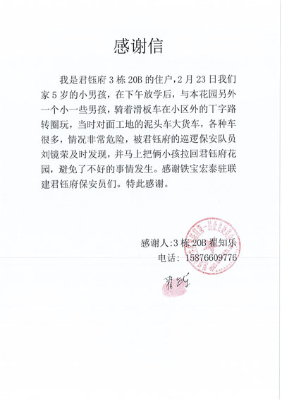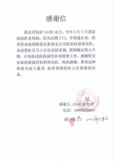 深圳市寶安區(qū)君鈺府小區(qū)業(yè)主致信感謝鐵保宏泰深圳保安公司駐聯(lián)建君鈺府保安隊(duì)安保隊(duì)員。感謝鐵保宏泰保安隊(duì)員為君鈺府的付出及生活的各種幫助。鐵保宏泰保安公司熱情為業(yè)主服務(wù)每一天。