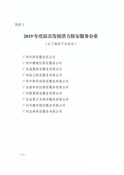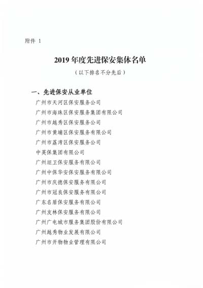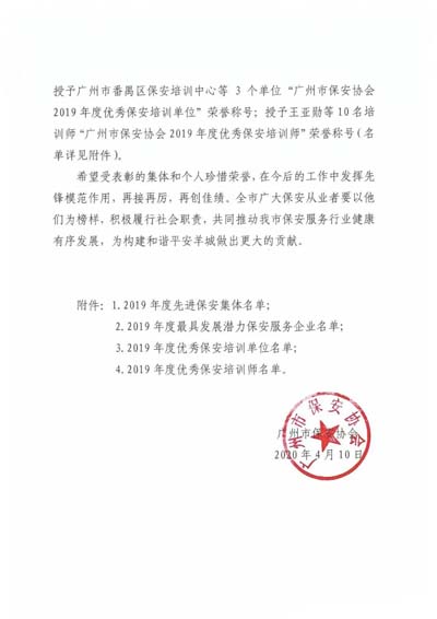 廣州市保安協(xié)會(huì)2019年度先進(jìn)保安集體”榮譽(yù)稱號(hào);授予廣州市保安服務(wù)總公司等10個(gè)單位“廣州市保安協(xié)會(huì)2019年度最具發(fā)展?jié)摿Ρ0卜?wù)企業(yè)”榮譽(yù)稱號(hào);授予廣州市番禺區(qū)保安培訓(xùn)中心等3個(gè)單位“廣 州市保安協(xié)會(huì)2019年度優(yōu)秀保安培訓(xùn)單位”榮譽(yù)稱號(hào);授予王亞勛等10名培訓(xùn)師“廣州市保安協(xié)會(huì)2019年度優(yōu)秀保安培訓(xùn)師”榮譽(yù)稱號(hào)(名單詳見下文)。